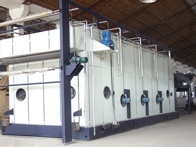 2、主蒸化箱體:主要包括進(jìn)布汽封箱、汽蒸箱頭段和汽蒸箱尾段以及若干個(gè)中段(每個(gè)中段容布量70m:兩個(gè)循環(huán)風(fēng)機(jī)、兩個(gè)熱交換器、兩套蒸汽加濕噴嘴等)、帶蒸汽加熱的頂部、底部輔助加熱管、帶照明的觀察窗、成環(huán)進(jìn)布輥、成環(huán)機(jī)構(gòu)、鏈條軌道、掛布輥軌道、掛布輥、主傳動(dòng)、帶容布量探測器的出布調(diào)整裝置、出布汽封箱、離心排風(fēng)機(jī)等。