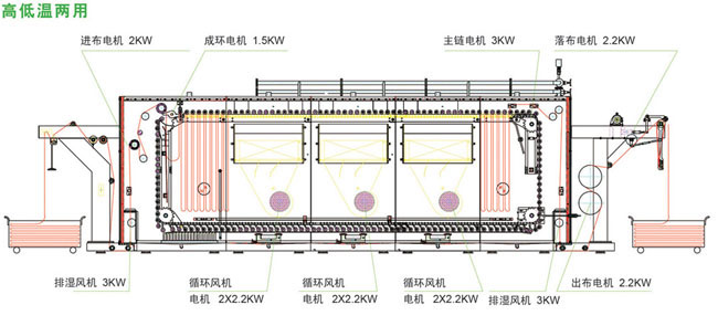 1、在進(jìn)布成環(huán)位置,設(shè)有噴霧裝置直接增加了濕度,裝置分為上中下3段式加濕,濕度補(bǔ)償更加均勻,使發(fā)色更充分又使成環(huán)穩(wěn)定,并能達(dá)到消除靜電功能。