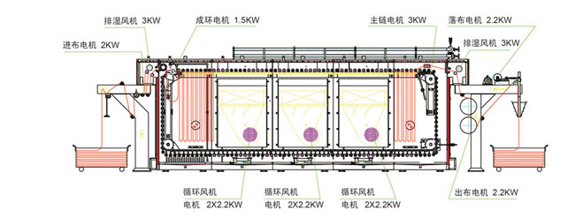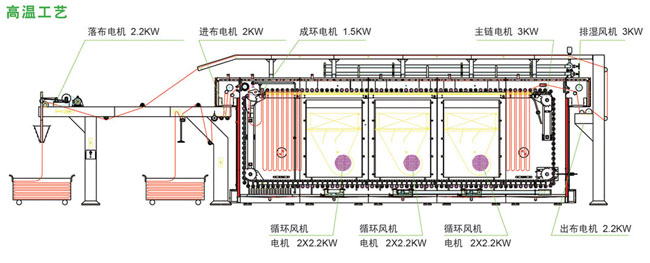 機(jī)器設(shè)計(jì)為下進(jìn)布、下出布,使多余的蒸汽及廢汽只能上而下溢出箱體,充分的利用了飽和蒸汽并節(jié)約用汽;比原上進(jìn)布節(jié)約用汽16.7%(原機(jī)型用量約1噸/小時(shí)-1.2噸/小時(shí),現(xiàn)機(jī)型用量約0.8噸/小時(shí)-1噸/小時(shí))。